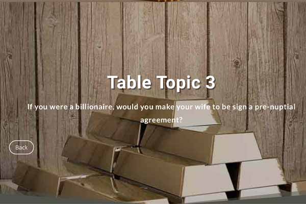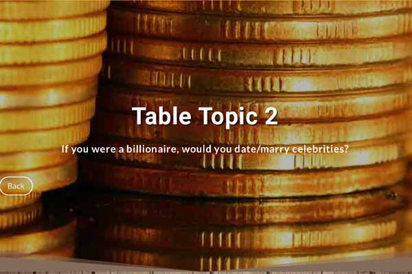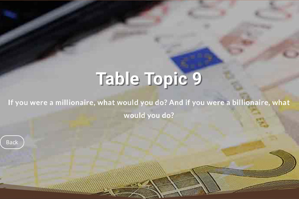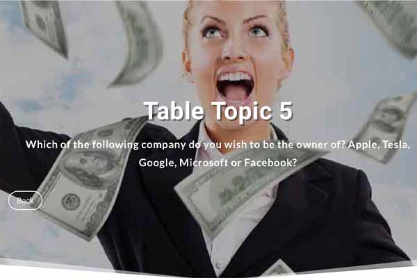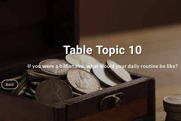 Anyway, Elaine continued to say that being rich will not change her life much. Nevertheless, with more money she can afford to buy more things. So if she is rich, she would sponsor all the refreshments for our toastmasters club’s chapter meetings.